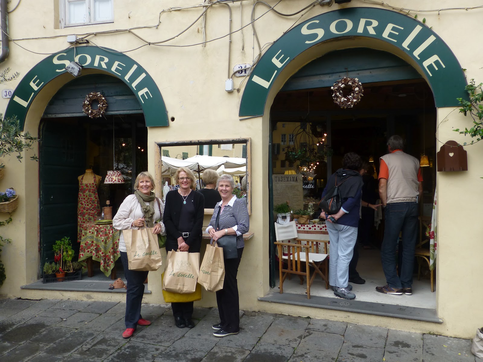 The next day we went to Lucca. My home for two weeks. It felt so good to be returning and showing everyone around. It was a little rainy which was a shame – but we managed to fit in a few sights and a long visit to my favourite shop – Lo Sorelle in the Antiteatro . It has gorgeous tablecloths and other assorted things. Carmel and Jill loved it and between us we bought a few things! Christmas will be great – lots of decorations, etc.