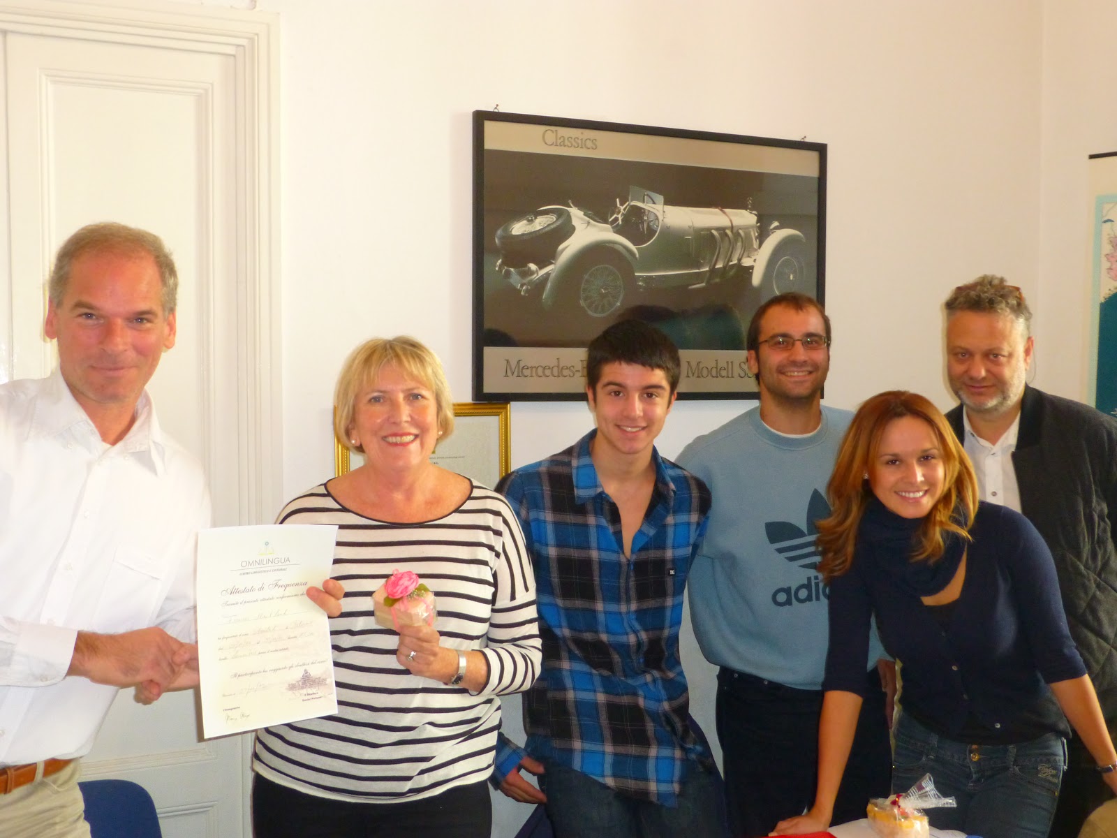 We had just about finished when the school director Daniel (looks like italian Steve Martin) and the school secretary (an adorable Brazilian girl called Simone) arrived in class to make a presentation. They gave me a certificate and a “piccolo regalo” – a little present of two locally made soaps all tied up with ribbon and flowers (Sanremo is known as the flower city). Such a lovely way to end.