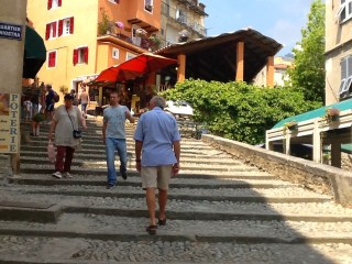After breakfast we took the road behind ill Rousse and discovered the Artisans trail. It’s a little like visiting a French style Maleny. Several hill towns with people working away in their little houses – caves really. We did our bit for the economy and bought a few little things. Music boxes, folk music CD, pottery jug, and a lovely lunch with a view back towards the coast. Steve would loved to have been driving his MG but it was hair raising enough on the narrow roads for me.