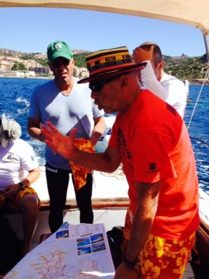 We drove for about half an hour through the wind, north of the township of La Maddalena. Finally found a beautiful bay where we could start our swim. Just like last year I went in the rubber ducky with Francesco and he dropped me half way along the swim so I would have about a 2 km swim and the others a 3 and a half swim. Off I went On my OWN! No pals to swim with as Phoebe decided to swim with the boys! What a goer she is.