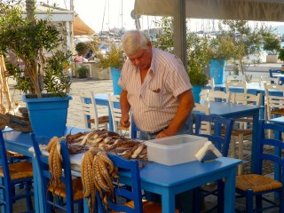 We moved onto to one of the many seafood restaurants and used a recommendation by the lady at the hotel. It’s probably her brother’s – but how do you decide? Probably could have gone to the one with the old many beating the octopus outside his place, or the one with the coal BBQ, or the one with chairs painted the colours of the rainbow. But in the end we were happy and shared a lovely BBQ dorado with grilled vegetables, salad and lots of local wine.