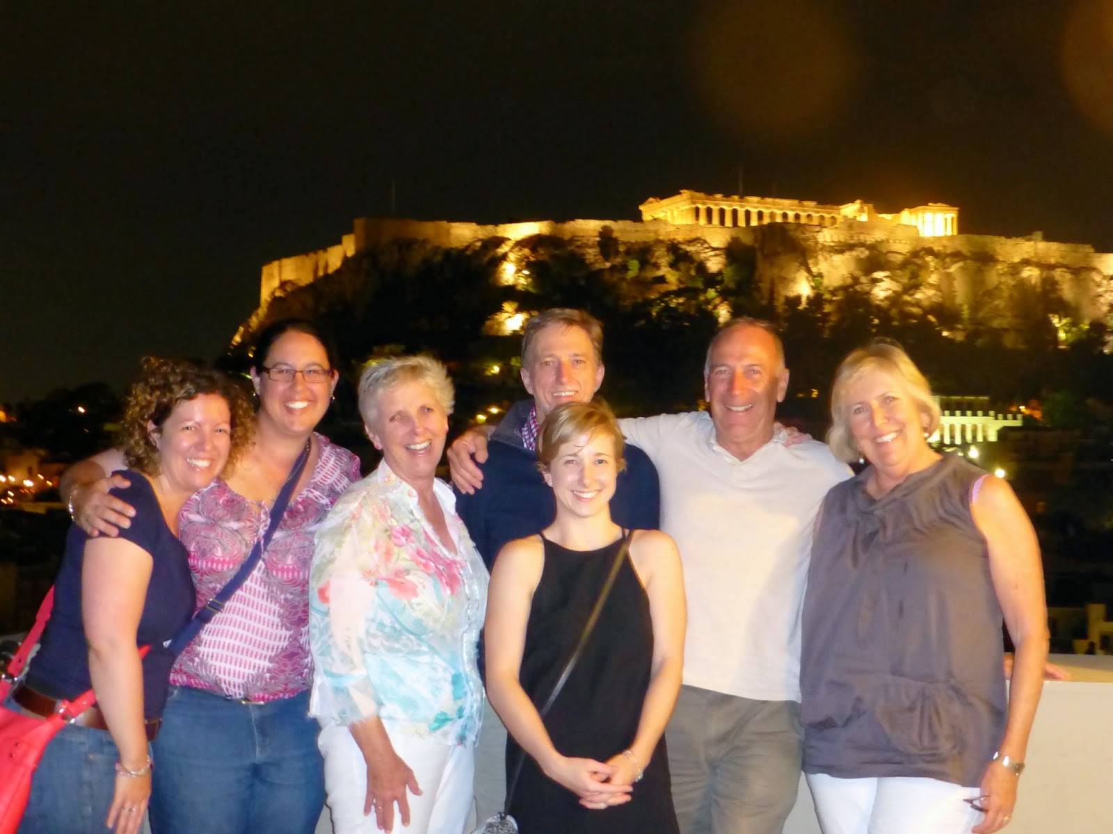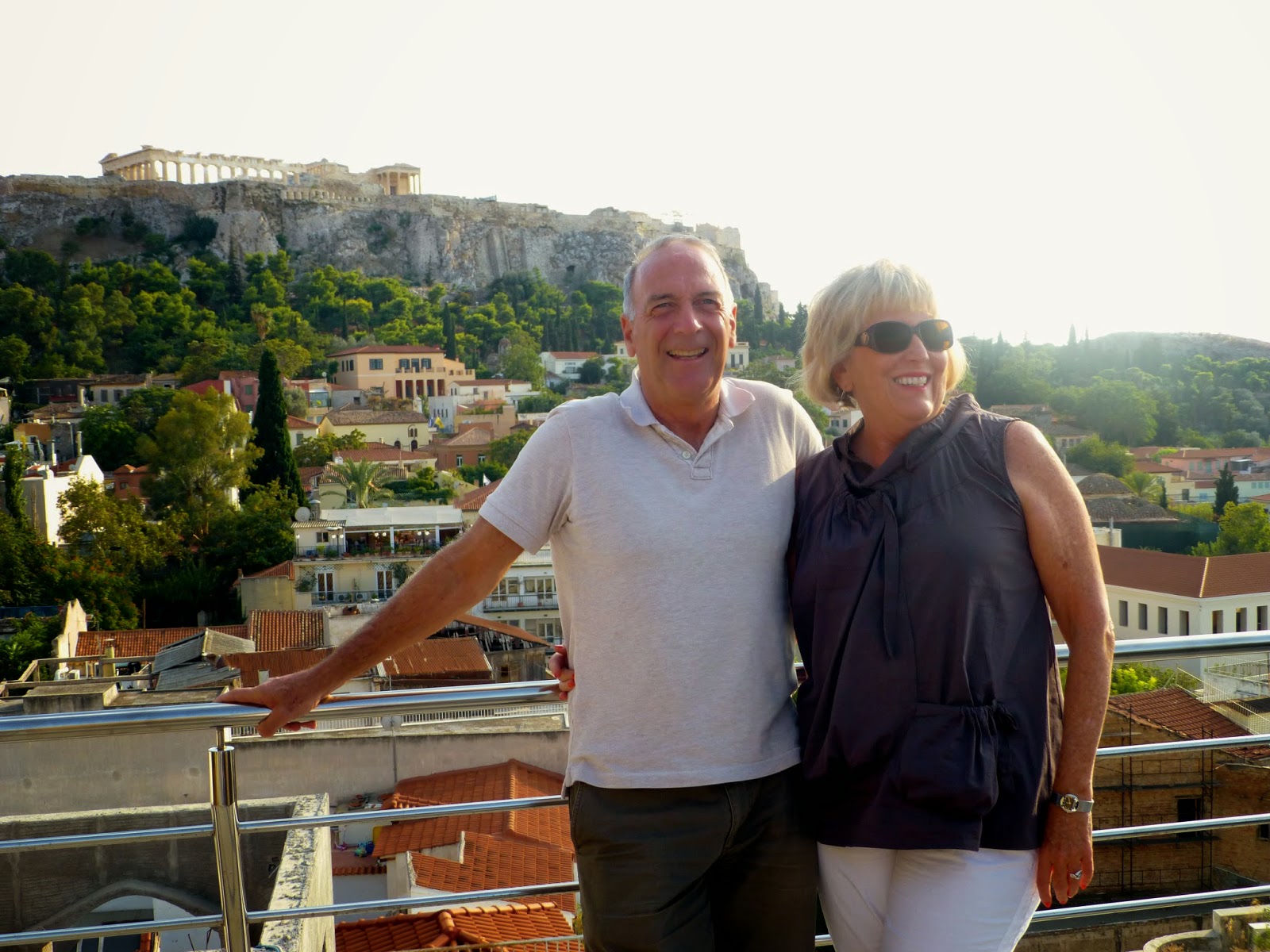 The flight was delayed and as it turned out we arrived at the same time as the Wilsons. We met in the baggage area. Shared a taxi to the hotel where we found Sarah waiting for us. A quick change and off we went to the roof top bar! Oh my what a view. Looked straight out toward the Acropolis. Magic! It’s so lovely to meet up with our good friends in such an exotic location.