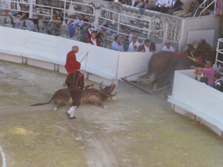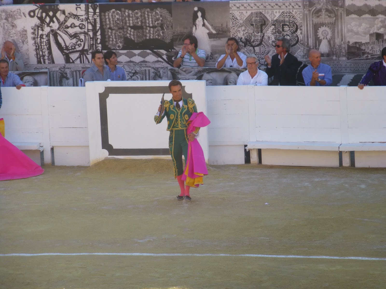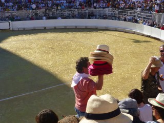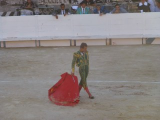 After all the pre fight was over it was down to business.. There were to be 6 bulls on show. Before it started someone walks around the ring with a big sign saying the weight and age of the bull – I’m glad they don’t give him a name.Too personal. Then it’s on. I tried to work out the way it ran, but hiding behind my hat and my red and black fan I had a little trouble. It seems there are about 6 toreadors who are the tempters and distractors for the main man – Jean B. They did a good job warming the bull up so he charged and they all ran. Training must include leaping over tall fences because they all did it wonderfully well. Then out does a horseman wearing armour and its his job to spike the bull with a lance. It was awful to see the bull charge the horse  – then to get stabbed by the horseman. He also wore tin over his legs as protection.
