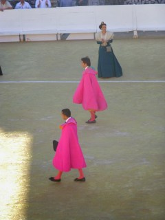 After all the pre fight was over it was down to business.. There were to be 6 bulls on show. Before it started someone walks around the ring with a big sign saying the weight and age of the bull – I’m glad they don’t give him a name.Too personal. Then it’s on. I tried to work out the way it ran, but hiding behind my hat and my red and black fan I had a little trouble. It seems there are about 6 toreadors who are the tempters and distractors for the main man – Jean B. They did a good job warming the bull up so he charged and they all ran. Training must include leaping over tall fences because they all did it wonderfully well. Then out does a horseman wearing armour and its his job to spike the bull with a lance. It was awful to see the bull charge the horse – then to get stabbed by the horseman. He also wore tin over his legs as protection.