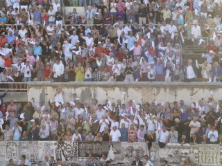 Then it was Arles and the bull fight. We managed to find a park not to far from the town gate and walked into what seemed like a huge party  – everyone was sitting or standing around in groups not unlike before a big Rugby match. Only difference is that generally people here don’t drink too much. In fact many were drinking sparkling water..