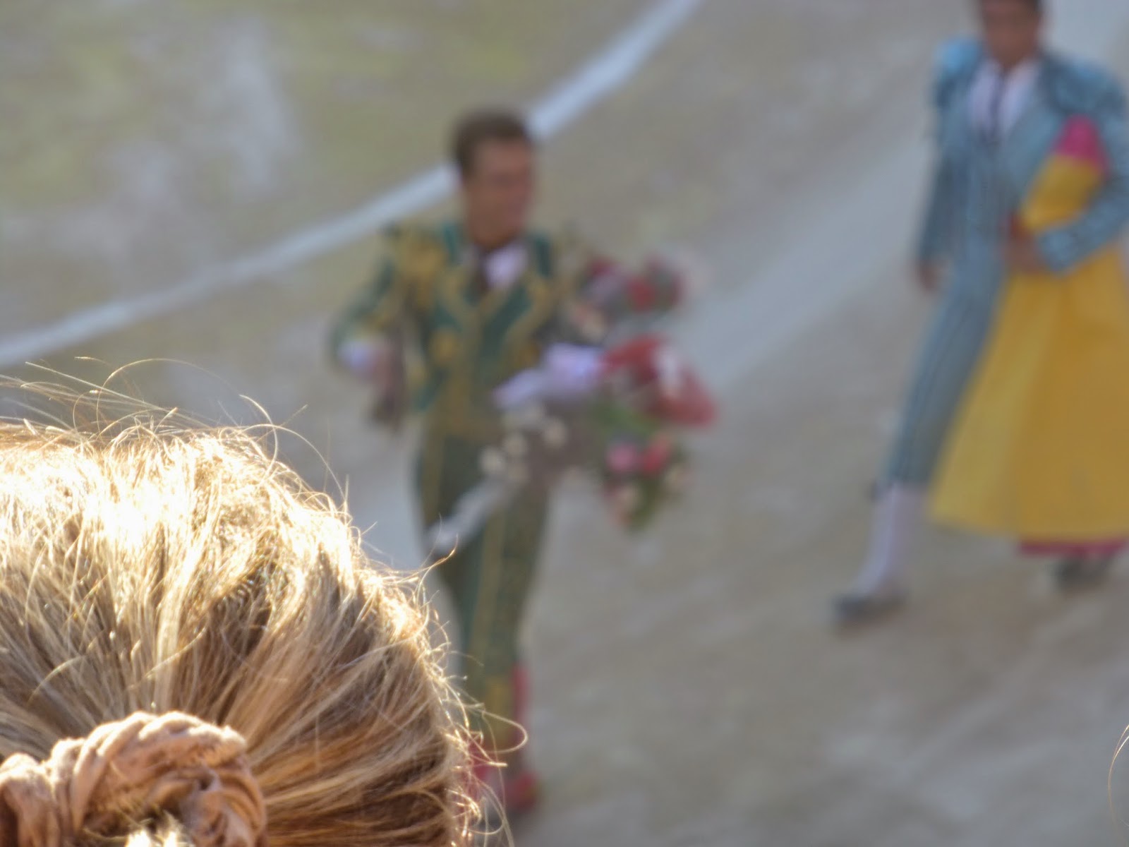 we entered the arena and climbed to our seats. Not too high up but unfortunately in the sun! People started sweating! The band warmed up, the singers started to create atmosphere, the green arena sparkled – literally, I don’t know what was in it but it was so sparkly! Then the procession started. The pretty ladies entered, the men on horses dressed to the nines, and finally the toreadors – men in extra decorated outfits, with what look like tights and ballet shoes. All very formal in their bowing to the officials, who were also all dressed up in spanish type of outfits.