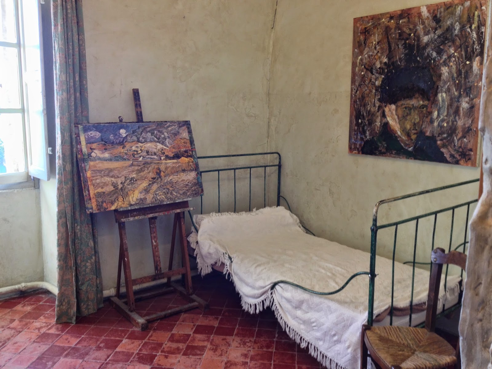 We arrived at St Paul’s hospital in the countryside. This was the asylum he lived in for a year. It’s a wonderful setting looking out across the fields  towards the mountains that feature in his amazing paintings. We walked in the fields where he painted the irises and the haystack. We visited his little bedroom with the soft green curtains over a barred window,  where he sat with his easel and captured the