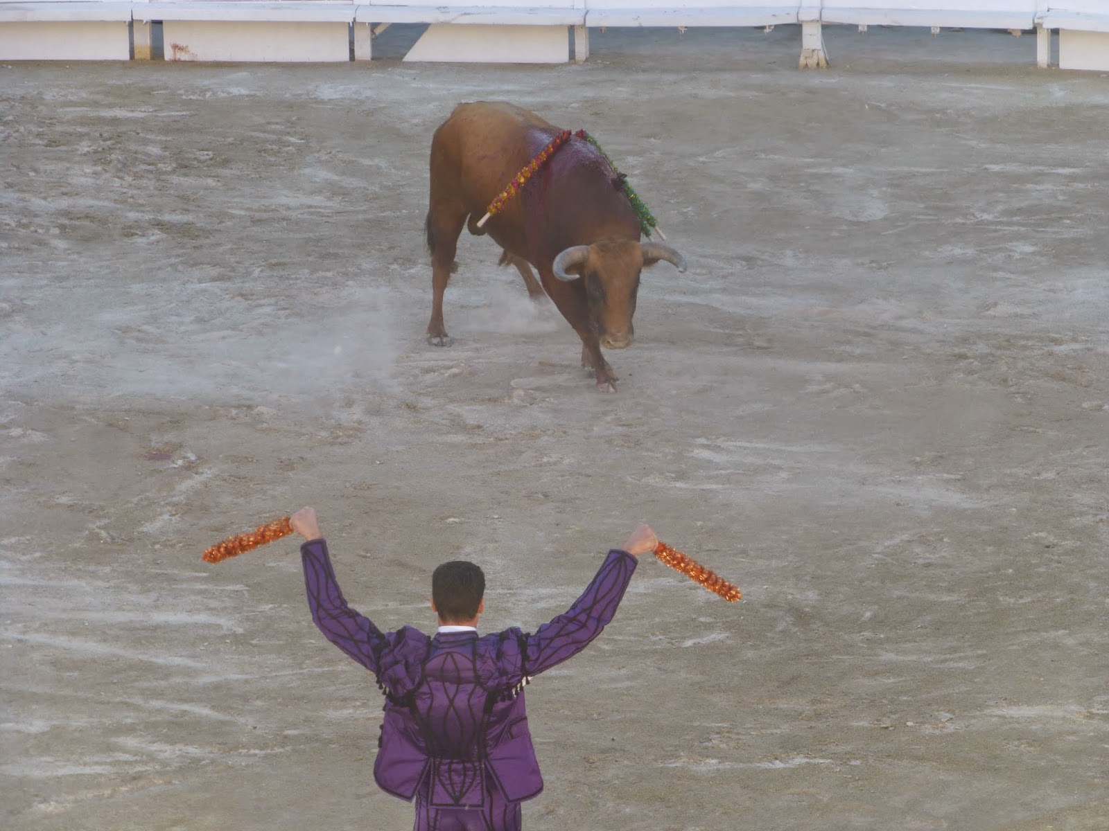Then its over to the guys who have what look like decorated sticks –  and its they job to poke them into the bull, so in the end he looks like he had coils all poking out of his head. If only I didn’t know they were sharp and dangerous because by now the bull was shedding blood and slowing down. Then the main man Mr Jean B set about mesmerising the bull and whipping his cloak around and got the bull closer and closer until he almost put his arms around him. Poor bull still doesn’t realise he is the enemy and is about to pierce him to death..