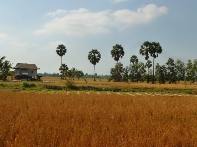 We eventually turned off at a lake know as the secret lake. It was man made during the Khmer Rouge time , hand dug by the Cambodians they had taken captive. It looks lovely now surrounded by trees and hills in the background. It doesn’t even hint at the blood that was shed in its making. We had to get out of the tuk to get up the hill at the end of the causeway and then continued along the road past fields with workers toiling in the heat.