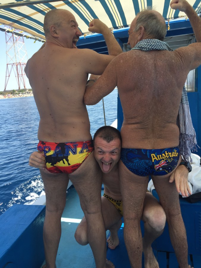 Carlo and Steve showing off their swim wear. Carlo has Espana and Steve Australian. Guiseipp takes on the scrum!