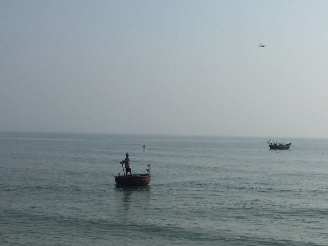 It couldn’t have looked more different to yesterday afternoon when I had my swim. Yesterday people everywhere – on deck chairs , walking, eating, swimming , playing games. Today the beach was deserted. A lone fisherman was making his way back to the beach in his round coconut style boat and a lady was wiping down the deck chairs. A few others started to appear but we were the only ones who dived in.