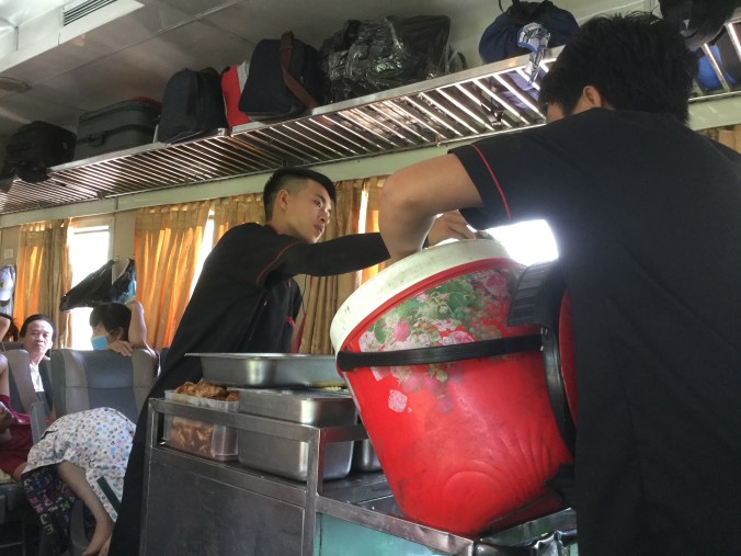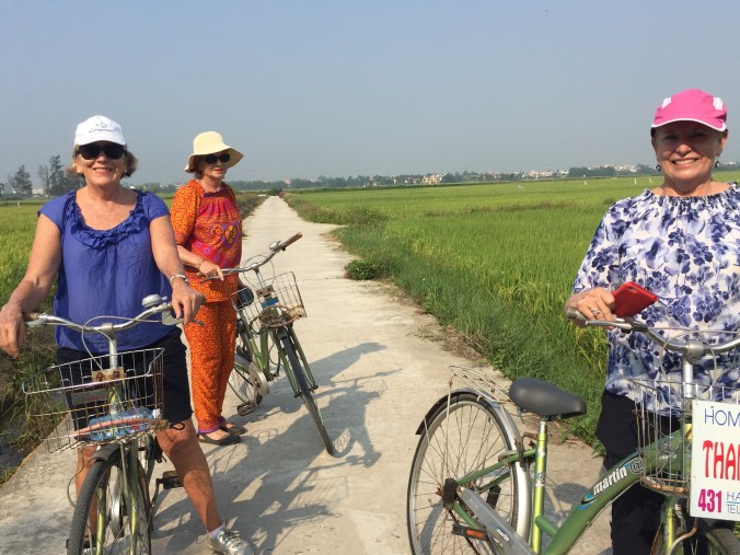 We eventually got back to Trinh’s where she had another great lunch prepared. She says she likes to make it for us but doesn’t want any payment. Of course we’ll sort something out and give her some money because it’s so very good. Today we had ‘delicious banh xeo It’s a rice pancake stuffed with pork, shrimp and bean sprouts. Yum. Then we had skewers of pork which you pulled off and wrapped in rice paper and stuffed with greenery including lots of herbs before dipping it in a gooey peanut sauce. Then we had mixed vegetables with chilli and a pumpkin dish. And my favourite ‘white rose’ . All delicious and dessert – another smoothie. This one coconut.