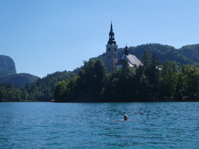 After our swim and returning the boat we lazed on the grass beside the lake and read and people watched. There are lots of people around but it doesn’t feel crowded. Some nice family groups with small children. We watched the little boats coming and going from the church island. It’s actually a little reminiscent of last year’s stay in Perast Montenegro where there was a similar church island in the bay.