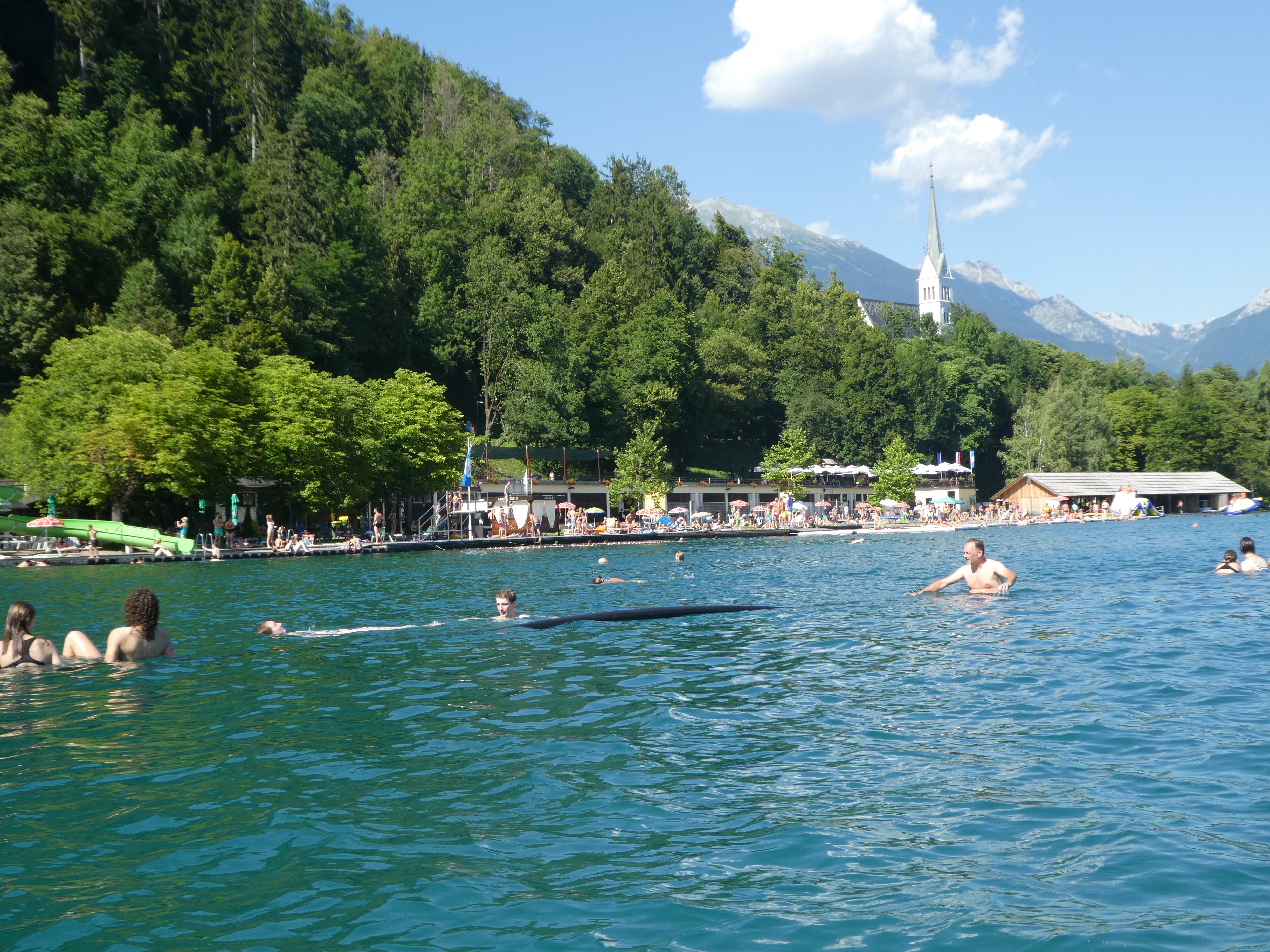 After our swim and returning the boat we lazed on the grass beside the lake and read and people watched. There are lots of people around but it doesn’t feel crowded. Some nice family groups with small children. We watched the little boats coming and going from the church island. It’s actually a little reminiscent of last year’s stay in Perast Montenegro where there was a similar church island in the bay.