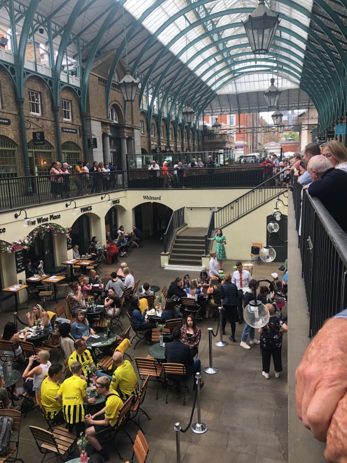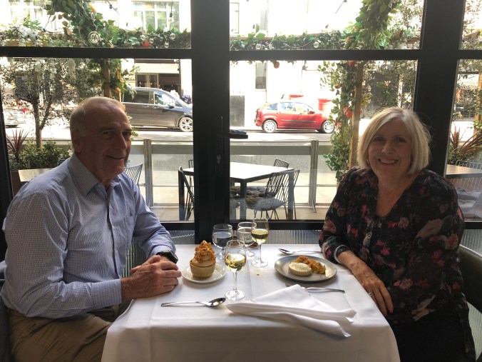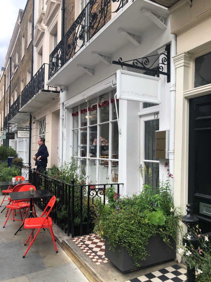 I came to a cobbled street so pretty it could be a movie set. Motcomb St. And there was Ottolenghi deli. I’m a Yotam Ottolenghi fan. We went to Rovi his restaurant in Belgravia two weeks ago and this is a little deli. There a lot of cakes etc and most come and take away. There are two little tables outside but as it was chilly I sat at the round shared table inside. It seated 6 and had a big vase of flowers in the centre for privacy?! On the table a young couple sat sharing food from the one plate then a woman with a headscarf and dramatic eye make sat spooning cake into her mouth as she talked loudly in her mobile phone. Not good company when it’s loud and in a language other than English.