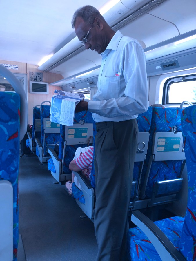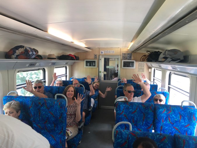 Finally , our 10.50 blue train arrived at 11.15 ! and on we scrambled. There was a buzz of activity as everyone searched for a seat. Hema had the list and it wasn’t long until we all had our assigned seat.