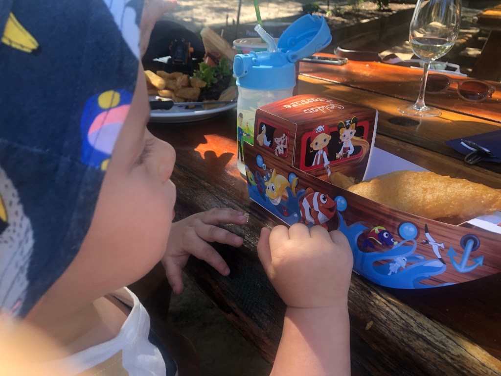 Our lovely lunch came – nice salads, sandwiches and fish & chips. Ollie liked his kids serve contained in a pirate ship!