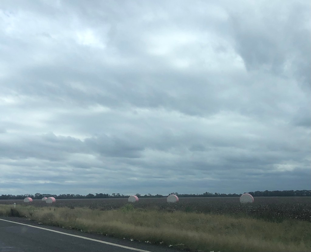 First stop – one of my favourite country towns, Goondiwindi. This is primarily cotton country. As you drive from Toowoomba you start to see little cotton balls along the roadside. And rolled bales in the fields.