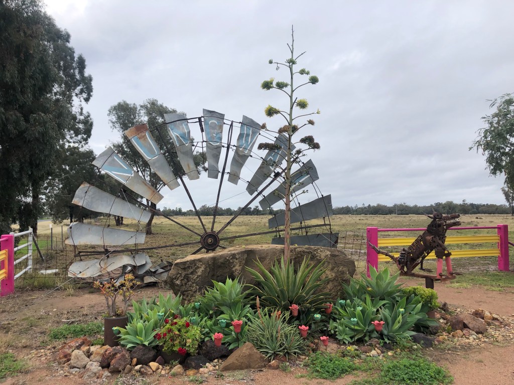 Onto Eulo and the giant metal sculpture of a lizard. We noted on the map of points off interest in the town – the lizard race track. Pity that’s not on.