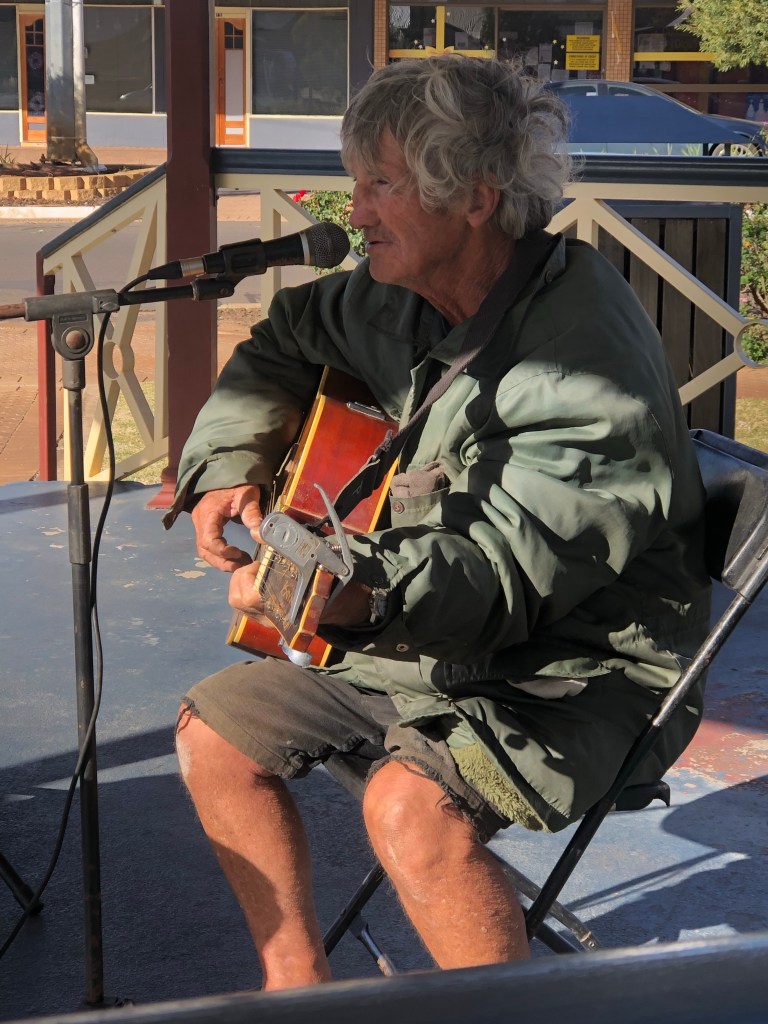 Sharing a sandwich in the park we were joined by the local busker. He was weathered by life in the country. Very few teeth but a big smile and loved a chat.