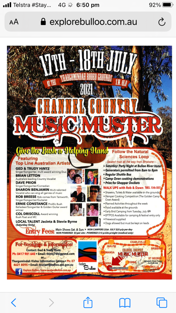 Looking at the ‘What’s On’ on Queensland website and the dates we could travel, we came upon the Thargomindah Channel Country Music muster.