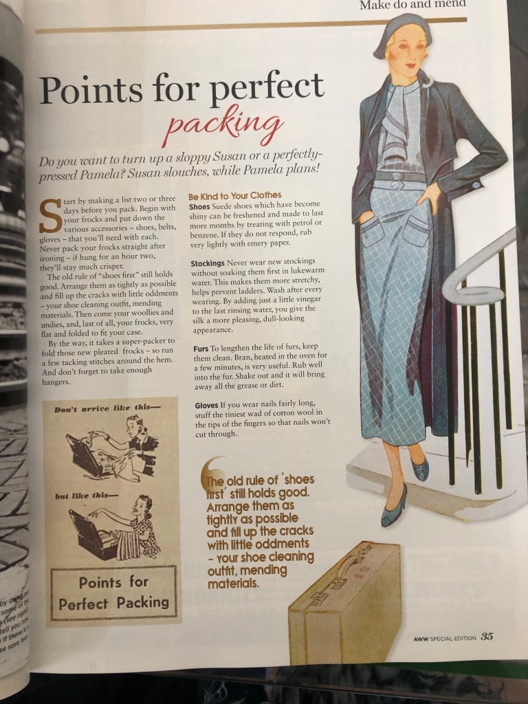 I particularly like some of the old magazines. I once wrote a blog post on how to pack for a holiday. This magazine gave timeless suggestions on packing including some hints about gloves. Something I had overlooked!!