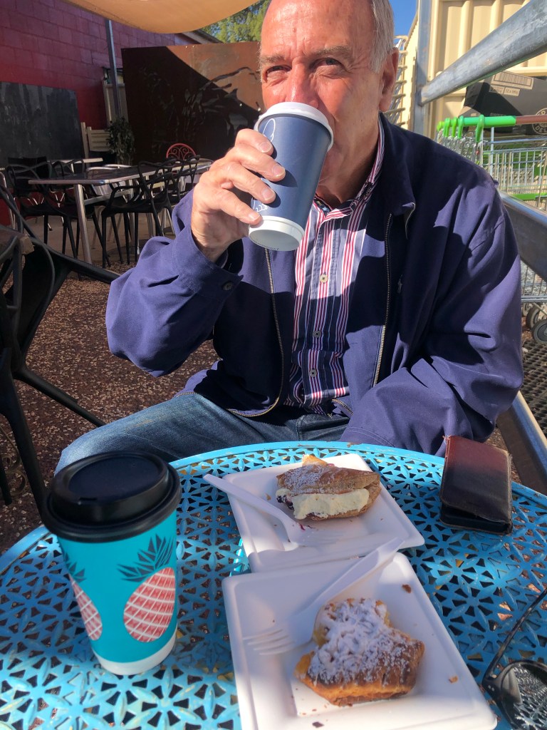 First stop was the bakery recommended by Sue, the mental health nurse we met in Thargomindah. She was right. It was great. the Sun was out and we sat and enjoyed both it and the coffee.
