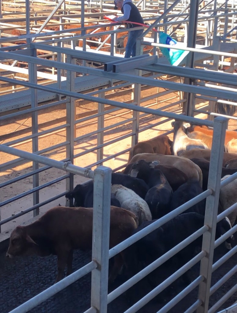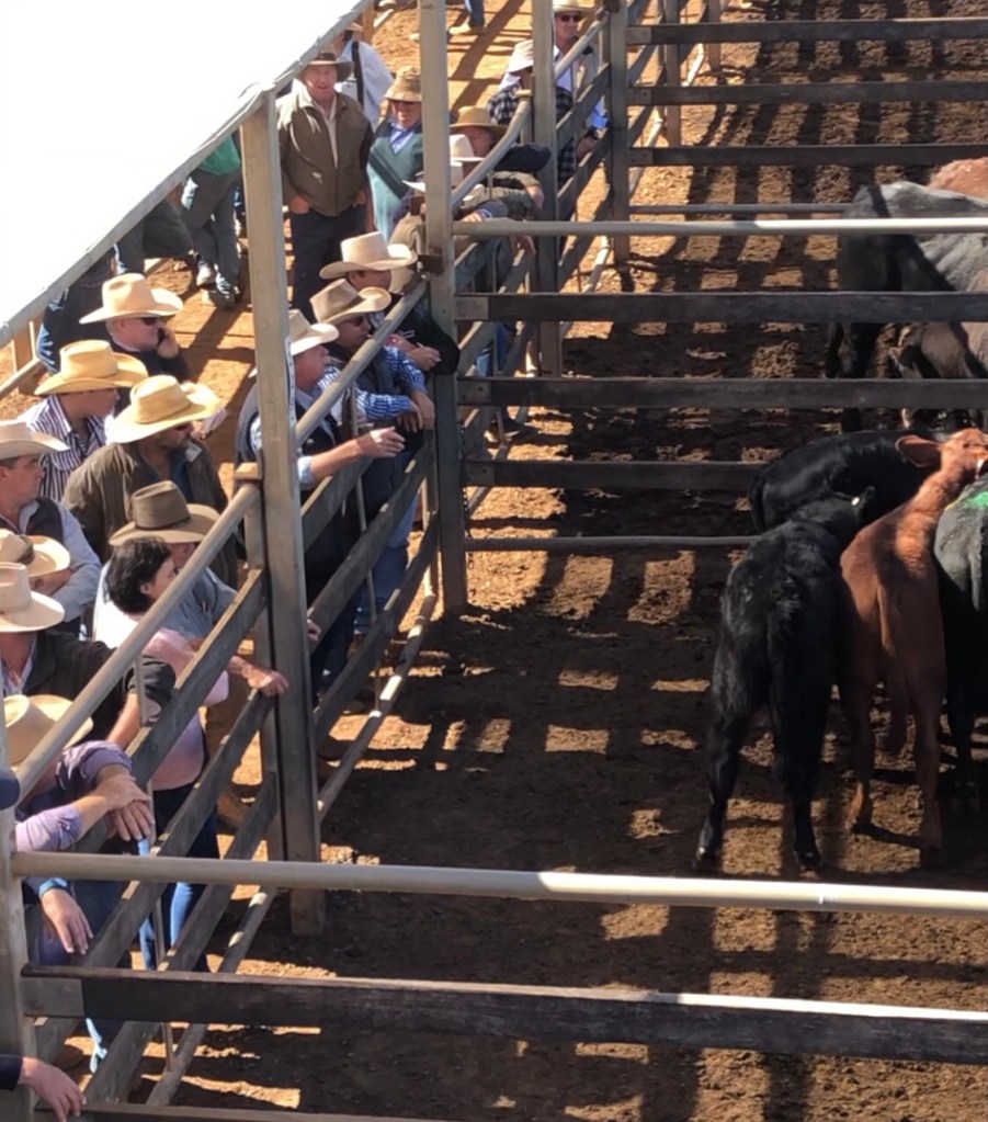 The cattle are all penned in groups. The auctioneer moves down one side shouting out prices at a cracking pace. The stock agents are on the other side bidding.