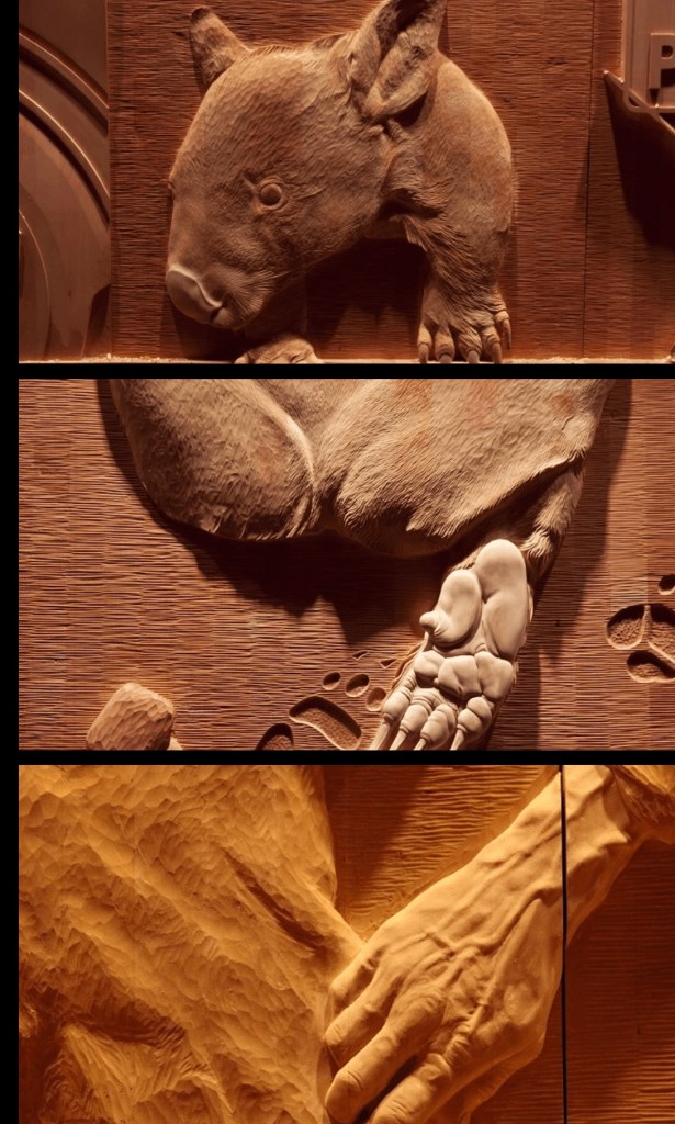 It is 3 metres high and 100 metres long and is sculpted entirely of Huon Pine. It tells of the history of this region of Tasmania. From the beginning when the indigenous population lived in the area, to the pioneers who began harvesting timber from the ancient forests. Following the pioneering era, there are images of the pastoralists, miners and hydro-electric scheme workers, shown along with the many animals found in the area and the horses who worked alongside pioneers.