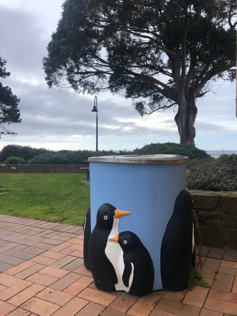 Naturally there are little Penguins all over town. It’s a lovely seaside place with mosaics, great public seating and a beach that would be great if it weren’t 12 degrees.