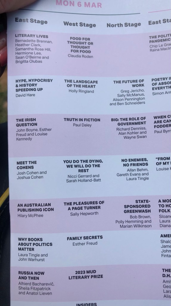 We spent the first night catching up with family and looking ….. and booking tickets to festival events and planning who I would see during Writers Week. It’s been particularly controversial this year with new director Louise Adler booking some speakers with strong views and opinions on the Israel – Palestinian situation as well as the Ukrainian Russian war. It’s providing a lot a comment in the papers and on TV.