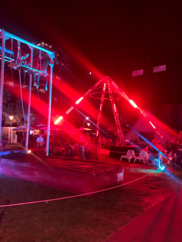 The show finished ….. we sat outside having a Gin & Tonic looking at the trapeze artists then walked a few blocks to another Square – all lit up and in party mode.