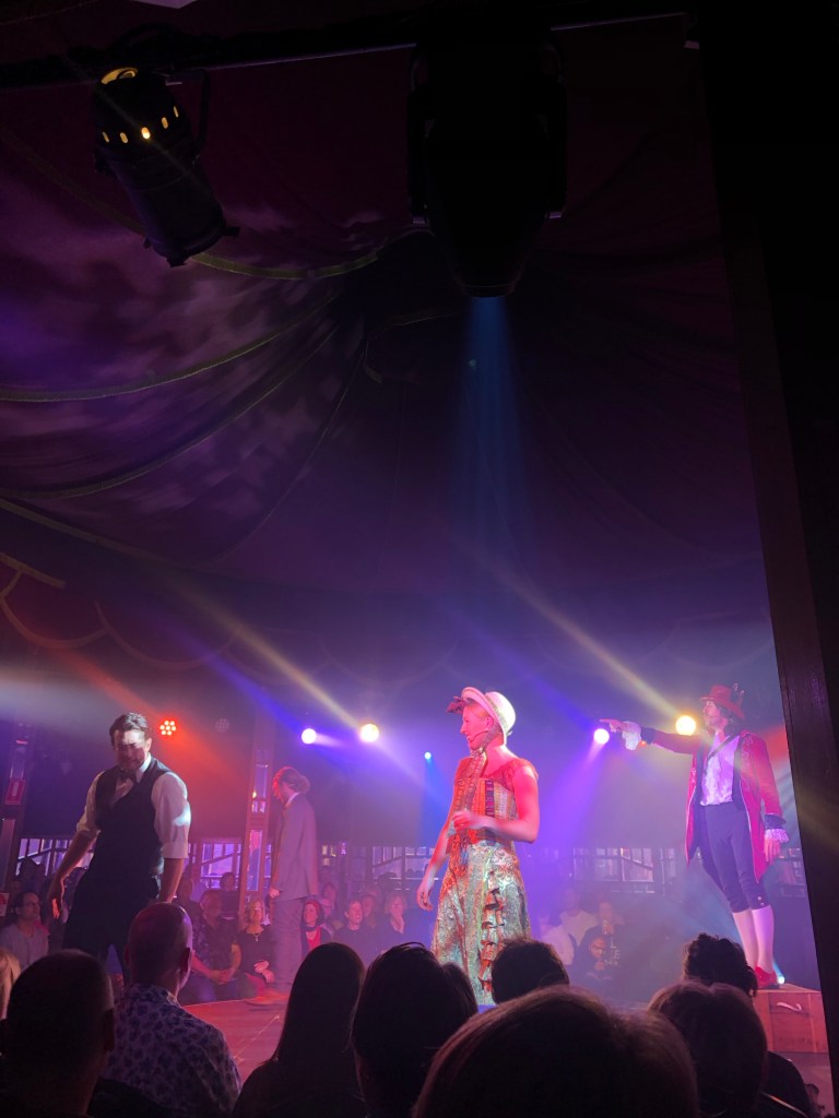 We scrambled into the Speigeltent, found seats and settled in for Elephant Man the Musical. You probably remember the sad story of the Elephant Man. A movie starring John Hurt. Now thanks to a wonderful director – a local team – including musician husband & wife – it’s now a musical.