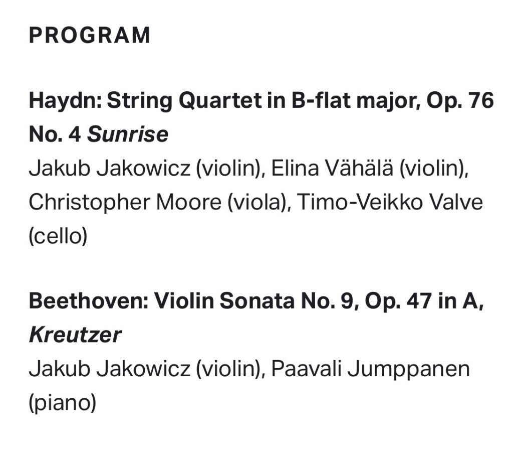 It was a stunning performance. The quartet was wonderful but the second piece a Beethoven for Violin and piano was simply amazing. The playing was so wonderful it is hard to describe. The room was spellbound and at the end stood and applauded.