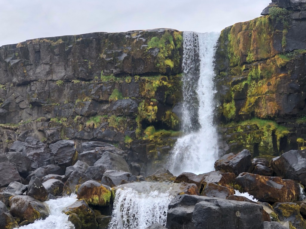 Our first stop was Thingvellir. It’s a National Park. – we’ll it seems all of Iceland could be considered a NP. Here there is evidence of the tectonic plates. And a waterfall. One of many in this country of high mountains lots of snow and volcanoes.