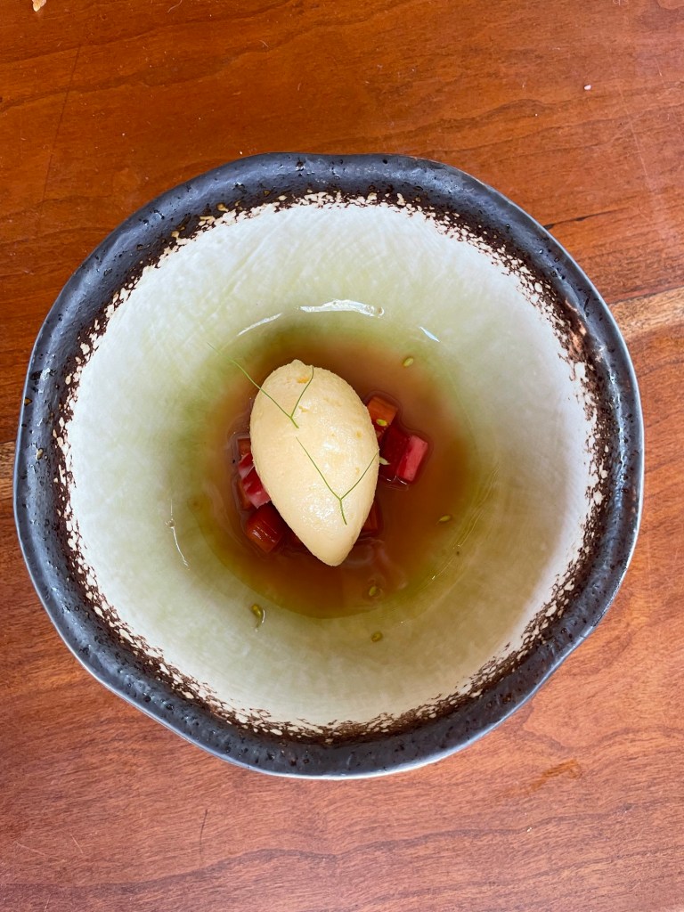 Dessert started with a popsicle on a stick. Watermelon flavoured sorbet.