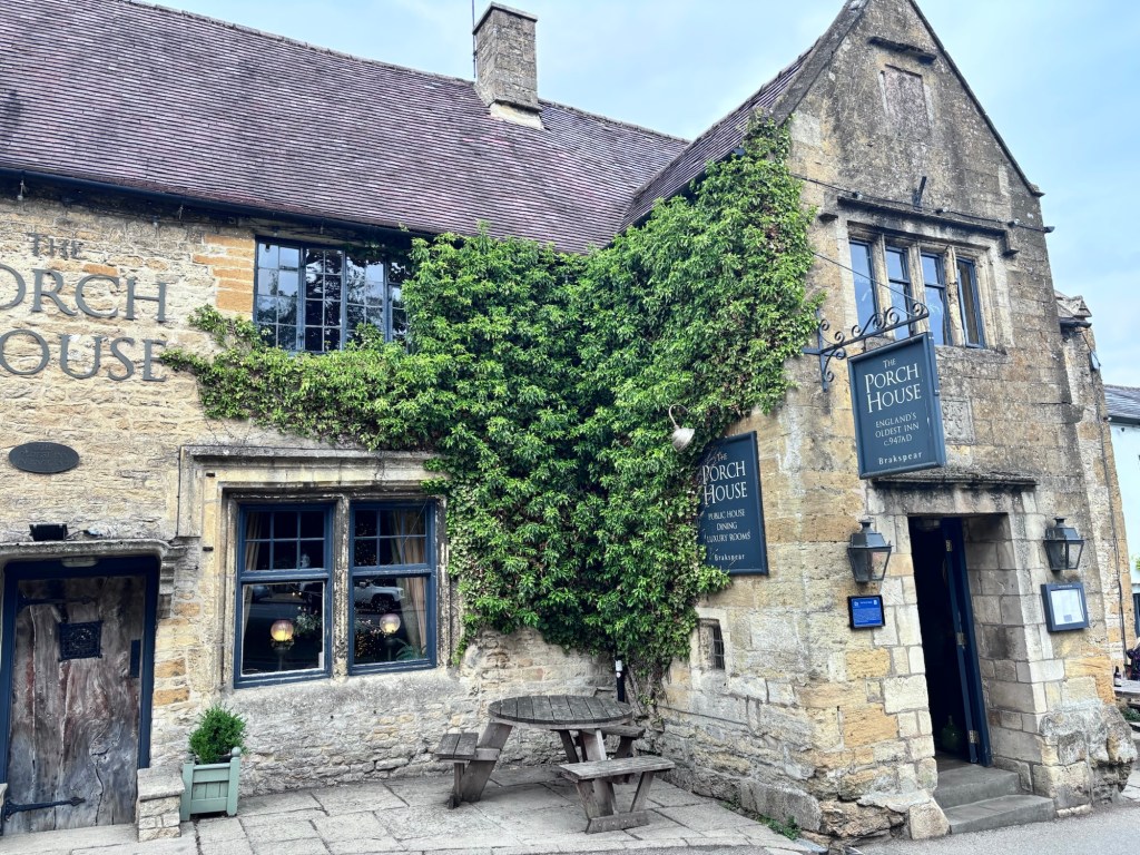 It was time for Stow on the Wold. Our room for two nights is in The Porch – reported to be the oldest inn in England. Well I’m not sure if that fact, but it’s old. Up and down steps, low doorways, beams, old lights, dark common rooms but very comfortable rooms. Ours overlooked the small park opposite.