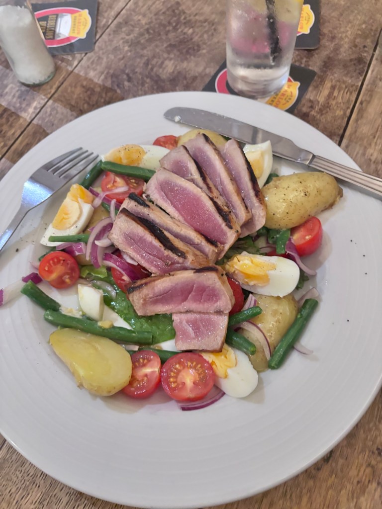 I then had grilled Bass on a bed of spinach with Burre Blanc sauce Steve had a type of fish stew. S I’m beautiful. Just don’t convert £ to Aus$. It’s frightening how much it all costs.