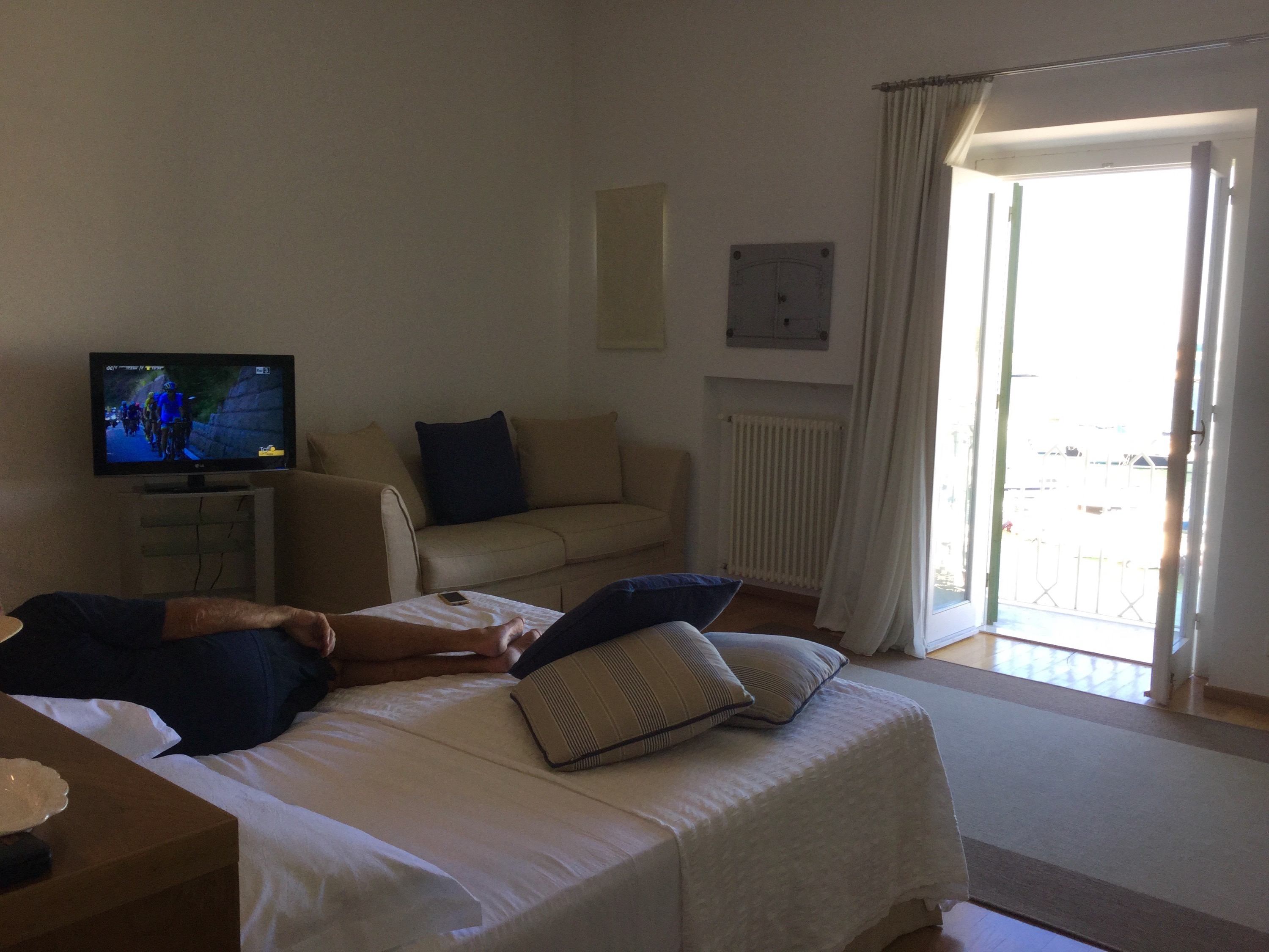 We observed the locals. I feel we are getting to know them! We went to the same bar and saw the same people walking. The Nonno with his grandson. The fisher monger who today was able to get his cart through the little lane. The man with the turned up collar being driven to his restaurant on a Vespa by one of his waiters. The handsome man on a pink bike who stops at the corner to observe and make a call (who to I wonder?). The mamma in the cute Smart Car who drops her daughter to work in the cafe. The teenager who rides the littlest, noisiest bike imaginable. And doesn’t he love the attention! The mother and daughter jogging together. All the nonno and nanna’s walking and sitting along the promenade.