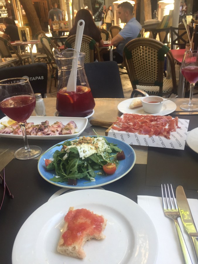 We made our way towards Santa Maria del Mare a large Gothic style church- an area we stayed in years ago with Pete, Clare and Helen. We stopped to rest and have some tapas at Tallers. It has great tapas and we tried a variety of really delicious dishes. With a little Sangria Tinto.