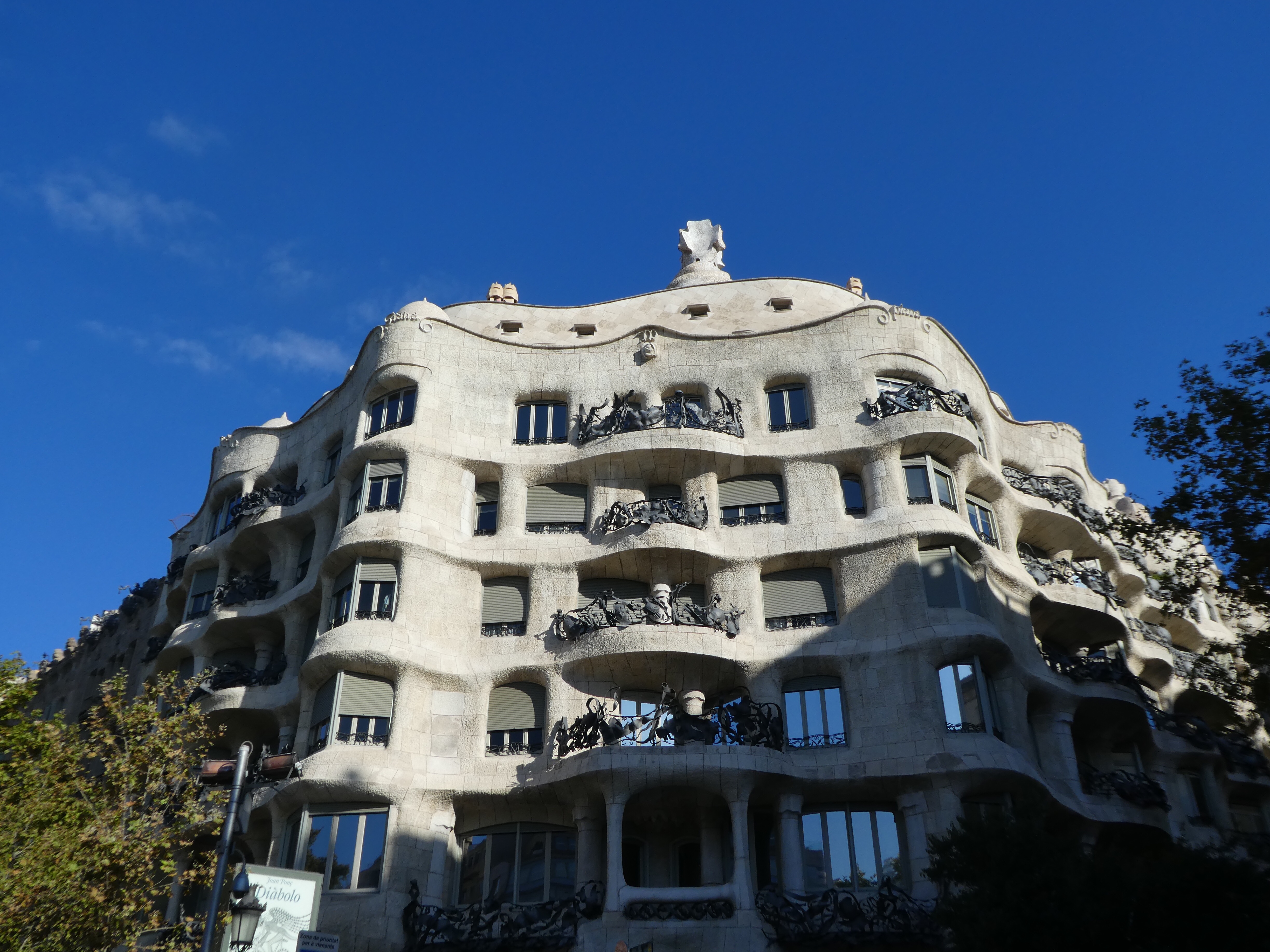 We continued along the wide Passeig, Boulevard style road with its trees giving a dappled appearance to the already decorative buildings. Then we came to La Pedrera, Casa Mila. Another famous Gaudi building.