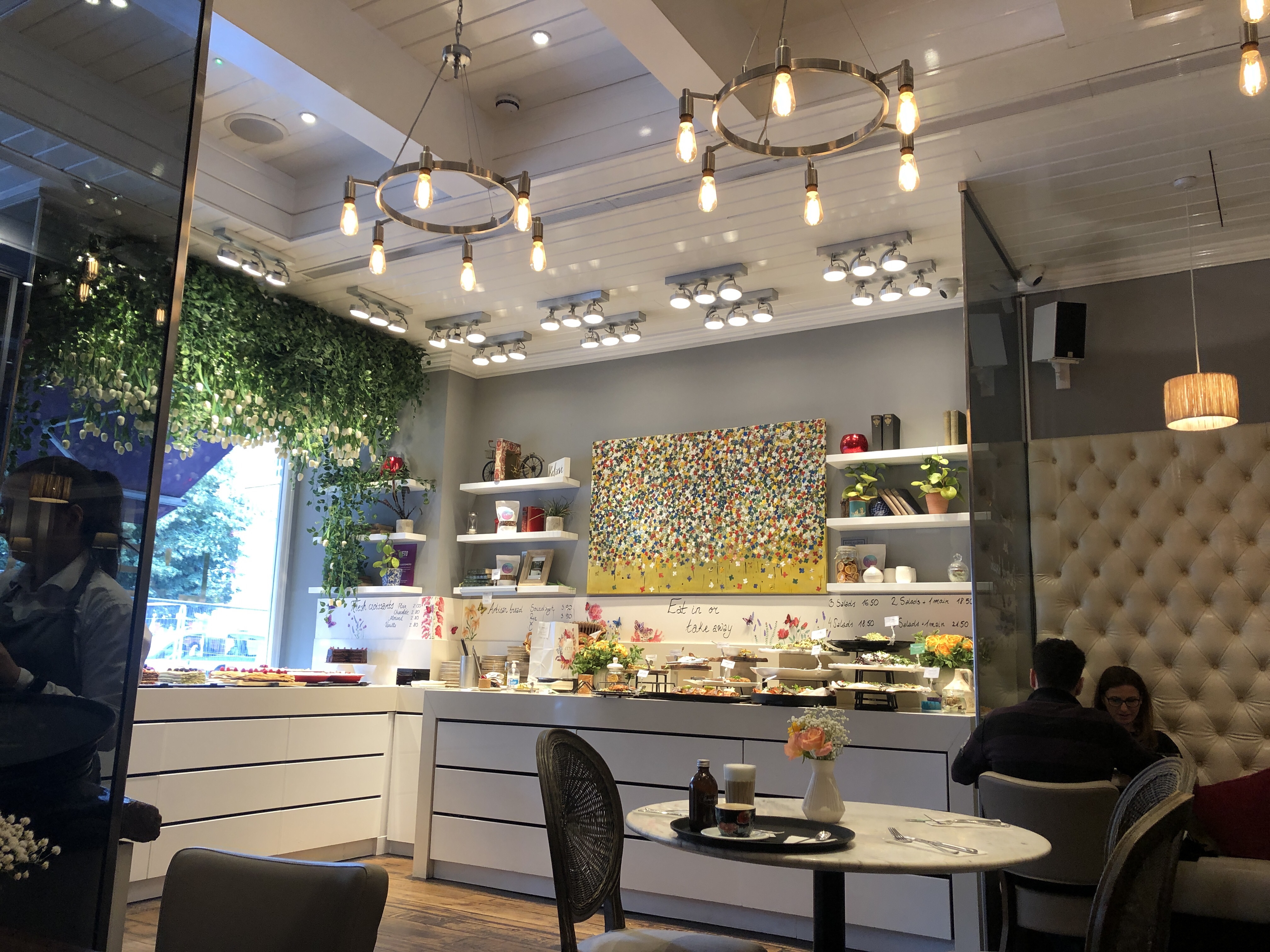 I came to a cobbled street so pretty it could be a movie set. Motcomb St. And there was Ottolenghi deli. I’m a Yotam Ottolenghi fan. We went to Rovi his restaurant in Belgravia two weeks ago and this is a little deli. There a lot of cakes etc and most come and take away. There are two little tables outside but as it was chilly I sat at the round shared table inside. It seated 6 and had a big vase of flowers in the centre for privacy?! On the table a young couple sat sharing food from the one plate then a woman with a headscarf and dramatic eye make sat spooning cake into her mouth as she talked loudly in her mobile phone. Not good company when it’s loud and in a language other than English.