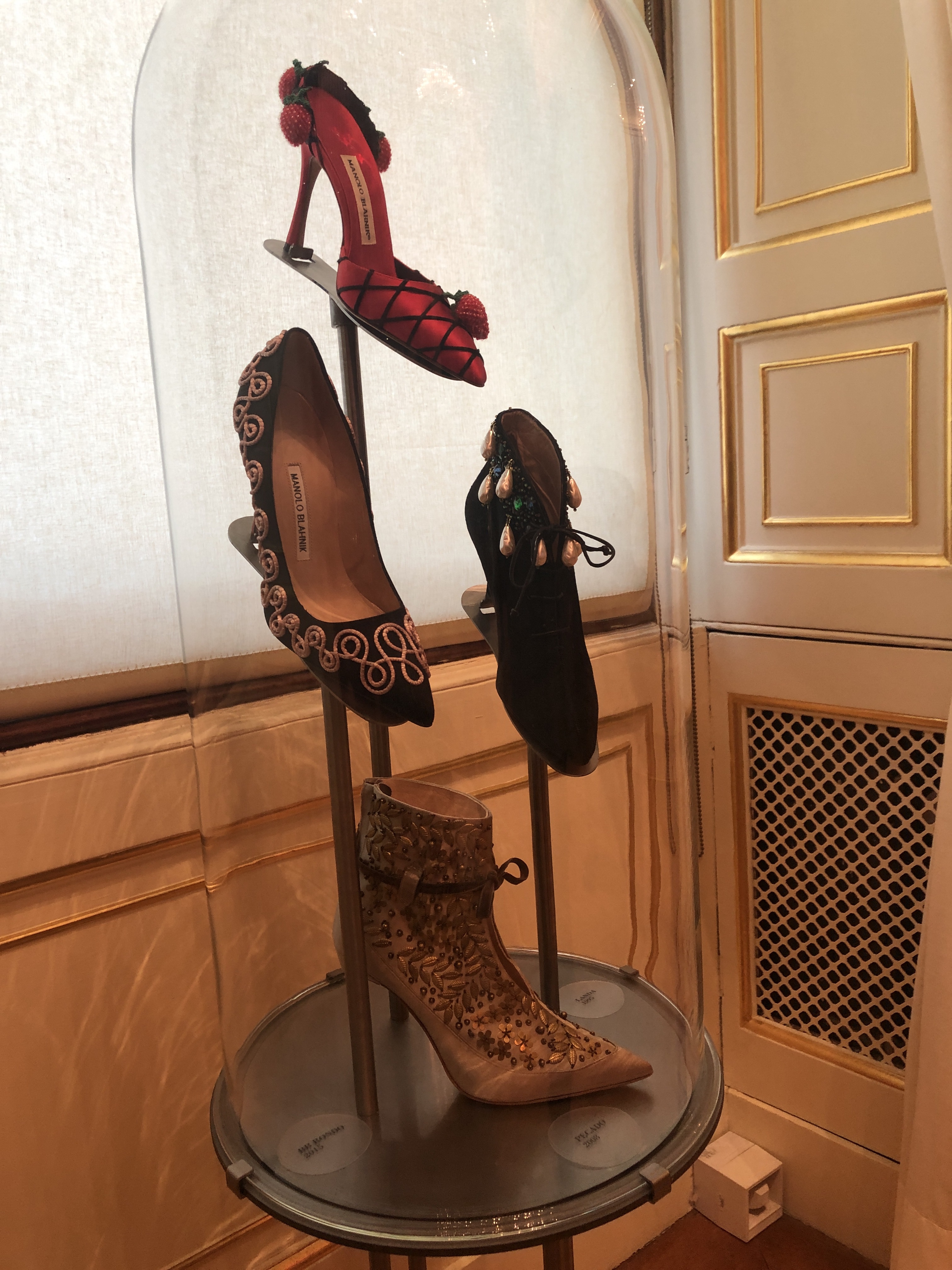 Not just any shoes but Manolo Blahník works of art. They have been arranged to match the colours and the themes of art in each room. It’s extraordinary.